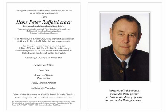Das Bezirks-Feuerwehrkommando Ried im Innkreis macht die traurige Mitteilung, dass der langjährige Bezirks-Feuerwehrkommandant Ehren-Oberbrandrat Hans Peter Raffelsberger völlig unerwartet am Mittwoch, 1. Jänner 2020 im 71. Lebensjahr für immer von uns gegangen ist. Wir erweisen unserem verstorbenen Kameraden in Dankbarkeit für seine langjährige verdienstvolle Tätigkeit die letzte Ehre. Die Trauerfeier findet am Freitag, 10. Jänner 2020 um 14 Uhr in der Pfarrkirche Oberberg statt.